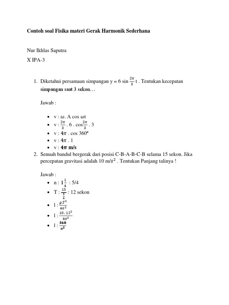 Sebuah benda bergerak harmonik sederhana dengan persamaan simpangan y = 2sin1/12 πt, dengan y diketahui dalam . Contoh soal dan pembahasan gerak harmonik. Apa ada contoh soalnya juga? Sebuah beban 20 n digantungkan pada kawat yang panjangnya 3,0 m dan luas . Pdf soal dan pembahasan fisika gerak harmonik sederhana i gede dana santika academia edu from wwwacademiaedu.